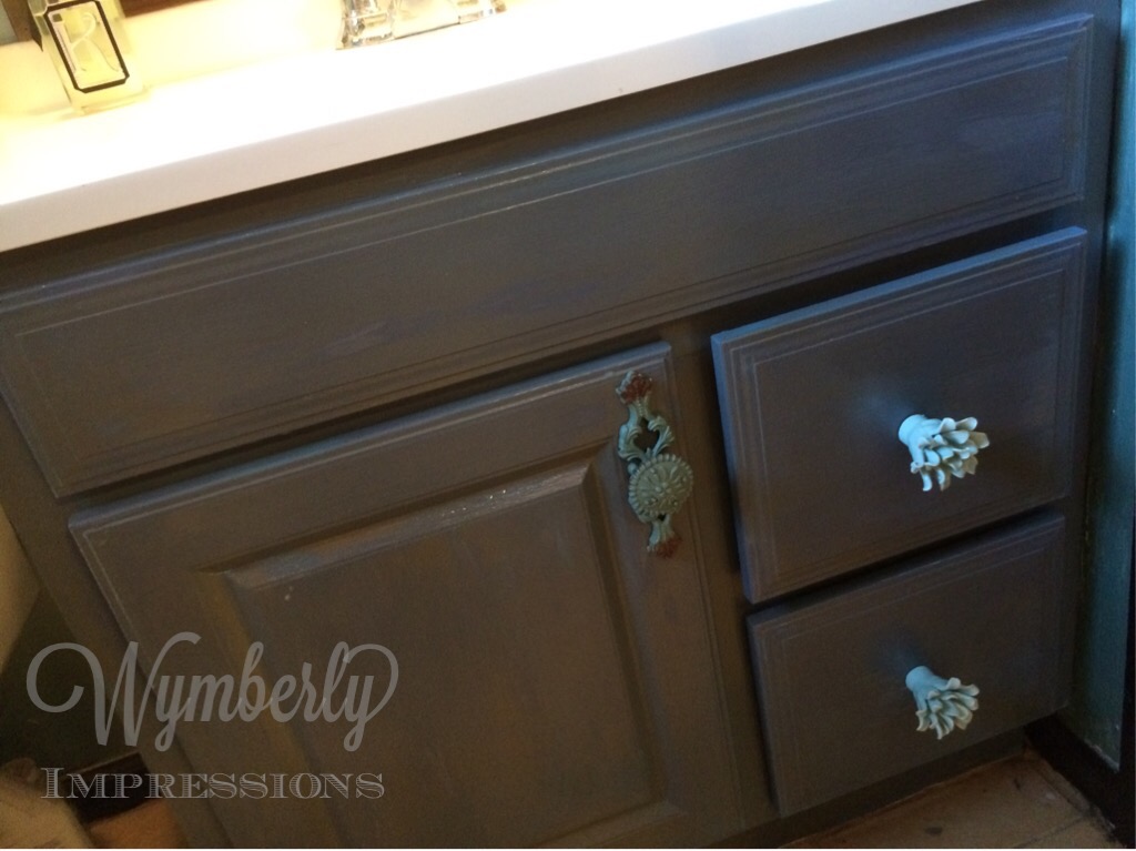 After a year and a half of painting, diy remodeling, decorating- you name it- I have finally put a personal spin on the master bath’s white, plain Jane Home Depot vanity. It’s functional. It works. But boy did I hate that white, fake wood facade.