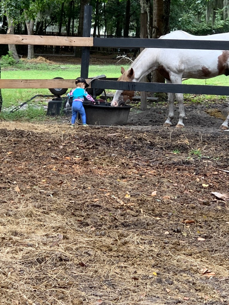 Designated outside clothes are a must. In the summer, we used lightweight long sleeve sun shirts and pants for sun and bug protection as well as skin protection from germs in say, the chicken coop. In winter, we use jeans and jackets. She always has on a hat and boots. She knows when we go out, we have to put on our outside clothes. It’s her routine. I used to try to dress her in her cute little outfits to go outside so that the pictures while she was playing would be cute and different. After a lot of laundering, I got smart. Who cares if she’s in the same outfit in every outdoor picture? She’s well protected and having a blast in mud puddles, the horses’ water trough, you name it. If it’s messy, she’s into it. We keep soap outside by the hose at all times to wash hands sporadically, especially if she’s been in the coop, and also to wash up before we go inside. Most often, she’s stripped naked before we go in because her outside clothes are so filthy. She and her clothes go straight into the wash those days.