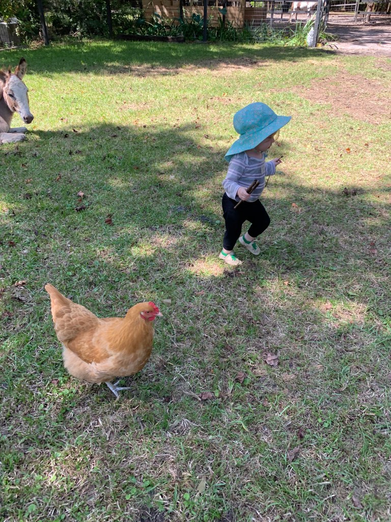 Duh, right? But, when you have somewhere to go and need to feed quickly or it’s pouring rain, waiting for her to “feed” aka dump out the chicken feed and play it in feels like a hurdle. Feed time is usually now about a 30 minute to an hour process when it could be 10-15 minutes. She wants to open and close feed bins. She wants to watch them eat and pet them. She wants to grab tomatoes off the vines while we feed our cat in the garden. She wants to play in the duck water. She wants to… learn. All of this leads to her learning how the world works. It’s fascinating to watch and very important that we give her the time to do so. Who cares if feed time takes a little longer or weeding/watering the garden becomes a few hour affair? We have make the time.