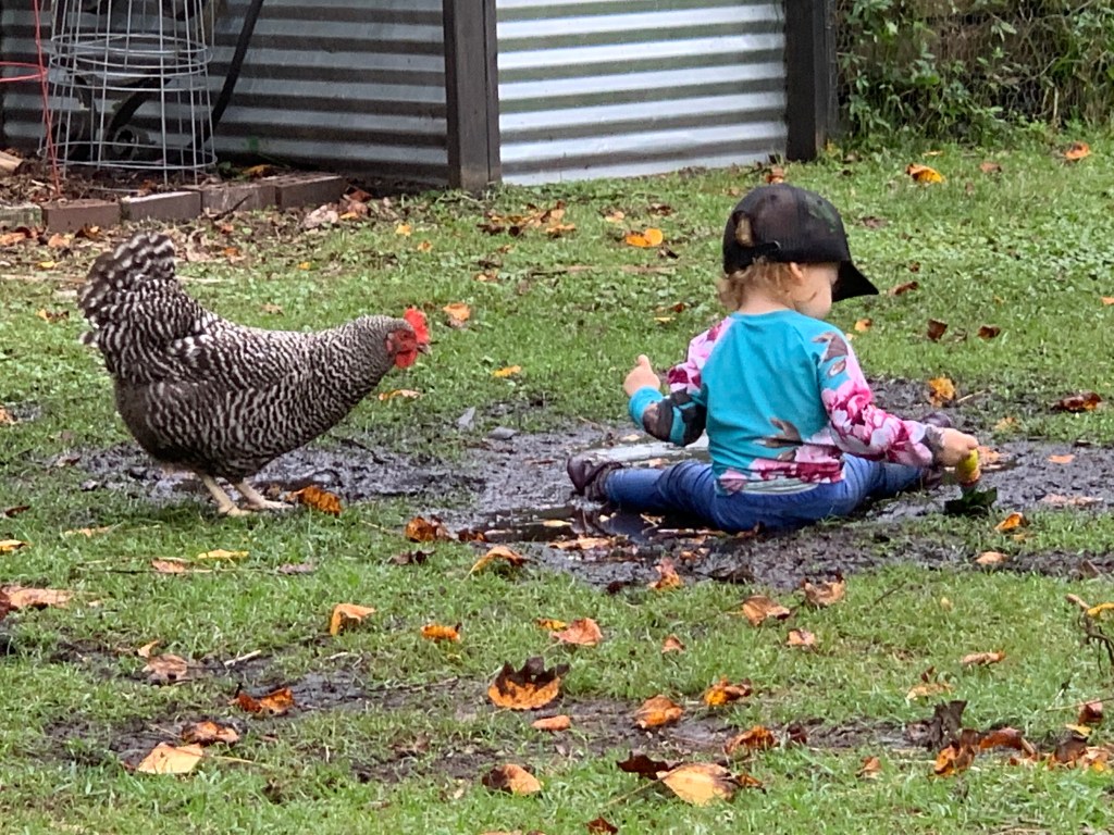 Of course it is! I/You knew that! But let me tell you… when it’s raining or really cold or sweltering hot, I am not feeling being outside, but she is. She doesn’t care if there is inclement weather. Outside is just where she wants to be, and as long as she is dressed appropriately (and it’s safe like not lightening) and provided enough snack/water, outside we go. Even when she was just starting to crawl, we’d lay out a blanket on the grass and let her go. We don’t provide a lot of toys for her. We don’t constantly entertain her. She finds toys in nature like sticks, leaves, rocks. She collects her favorites to save in a pile for the next time we go outside. Butterflies, the wind and of course the chickens/ducks/guineas entertain her to no end. Sure, there are times when she decides to sit down with the chickens in their coop that I cringe a little. It’s definitely not a pristine, germ-free surface in there which brings me to my next point!
