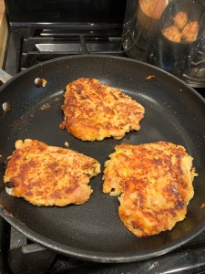 4. Drop a palm sized dollop of batter into skillet. You can dredge the batter in flour beforehand if you’d like. I tried with and without dipping it, and I preferred putting the batter straight in. Less messy. If you’re pan is large enough, you can do 2-4 cakes at a time.